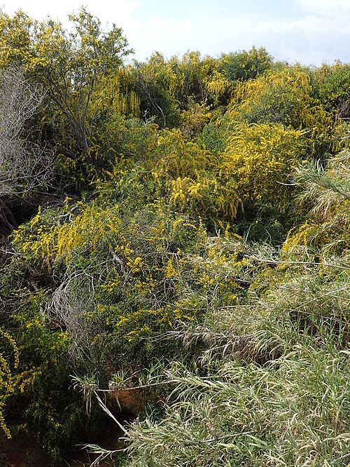 Nelle aree a clima mediterraneo, Acacia saligna è la specie legnosa più coltivata non principalmente per il legname, ma per svariati altri usi come: la protezione e il miglioramento dei suoli, rimboschimenti, come pianta ornamentale, ma anche per l'estrazione di tannini dalla corteccia, foraggio. Vettori antropici d'introduzione e dispersione involontaria di A. saligna sono principalmente legati alla movimentazione di suoli contaminati dai semi o da frammenti vitali dei succhioni radicali e all'abbandono nell'ambiente di scarti di potatura. Il passaggio delle auto può contribuire alla dispersione dei semi all'interno dei legumi. Non si può escludere che semi di A. saligna siano introdotti o dispersi come "autostoppisti" su veicoli, macchinari ed equipaggiamenti. Da nuclei già costituiti, A. saligna può diffondersi anche attraverso una serie di vettori naturali: animali (formiche, roditori, uccelli), vento, ma è soprattutto grazie all'acqua che i semi possono essere dispersi sulle distanze maggiori.