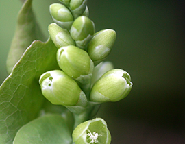 La fecondazione di P. perfoliata avviene prevalentemente per auto-impollinazione, perciò non necessita di specifici insetti impollinatori per lo sviluppo di frutti e semi. La specie esibisce una strategia altamente competitiva nella produzione dei frutti (giugno-ottobre), con due picchi: il primo a luglio, dove P. perfoliata si assicura la produzione di semi anche negli anni particolarmente aridi, e il secondo in autunno (settembre-novembre), coincidente con la stagione migratoria degli uccelli, mezzo di diffusione della specie. Ogni pianta è in grado di produrre 50-100 semi e un periodo di vernalizzazione è necessario per la germinazione. I semi possono rimanere vitali fino a 6 anni, nonostante la vitalità diminuisca sensibilmente con il tempo. Acqua e fauna (uccelli e mammiferi) sono i principali mezzi di dispersionedi frutti e semi.