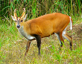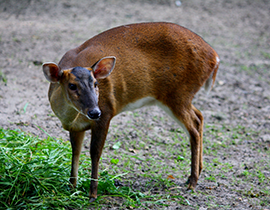 Si tratta di un piccolo cervide, di appena 40-45 cm di altezza al garrese. I maschi sono leggermente più grandi delle femmine e sono caratterizzati dalla presenza di piccoli palchi, lunghi fino a 7 cm. L’aspetto probabilmente più peculiare del muntjak della Cina, sono i canini molto pronunciati, lunghi circa 3 cm. Come altri cervidi, il colore del mantello è generalmente rossiccio, ma in inverno vira al bruno-grigiastro, mentre le parti inferiori sono perlopiù chiare. Il muntjak della Cina è noto anche come “cervo che abbaia”, in virtù delle tipiche vocalizzazioni dei maschi.