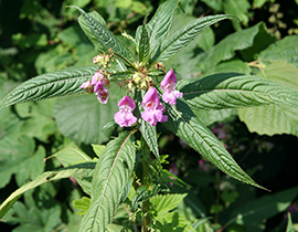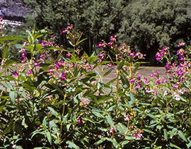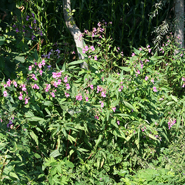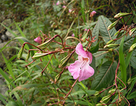 La Balsamina ghiandolosa è una pianta erbacea, annuale alta fino a 2 m (la pianta annuale più alta d’Europa!). Il nome scientifico richiama due caratteristiche della pianta: Impatiens (“impaziente”) si riferisce ai frutti (capsule) che a maturità “esplodono” appena toccati, proiettando i semi a notevoli distanze; glandulifera si riferisce alle ghiandole che si trovano ai nodi del fusto, sui piccioli e alla base delle foglie. I fiori, di colore che varia dal bianco al rosa, al porpora hanno una forma particolare ed inconfondibile: grandi 2.5-4 cm, la corolla presenta due labbra (superiore rivolta verso l’alto e inferiore rivolta verso il basso) ed è prolungata posteriormente in un sacco, che termina con un breve sperone. Differenze di colore, forma e dimensione dei fiori, caratterizzano le altre specie alloctone del genere Impatiens, talvolta invasive in Europa.