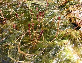 Specie acquatica perenne, sommersa, con radici avventizie e rizomi che ancorano la pianta al substrato. Il fusto esile e poco ramificato, può crescere fino a 6 m di lunghezza. Le foglie verde scuro, lunghe 5-20 mm e larghe 2-3 mm, ottuse, hanno margine intero, sono fortemente arcuato-ricurve, conferendo alla pianta un aspetto arricciato; spesso presentano incrostazioni di carbonato di calcio sulla pagina superiore; la disposizione è a spirale attorno al fusto, con addensamento nella porzione terminale. La specie è dioica, porta cioè i fiori maschili e i femminili su piante separate. I fiori femminili molto piccoli, con 3 petali bianchisono portati da peduncoli filamentosi sulla superficie dell’acqua, mentre i maschili galleggiano liberamente. Fuori dall’areale nativo è nota solo la pianta femminile, che non produce frutti e semi. Il frutto è una capsula contenente all’incirca 9 semi.