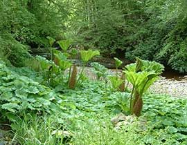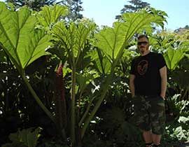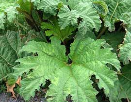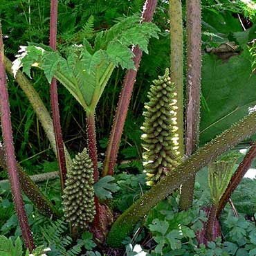 Pianta terrestre erbacea perenne, che raggiunge 2 m di altezza. Nei climi freddi si decompone d'inverno e ricresce a primavera a partire da gemme lunghe 25 cm ricoperte da squame di colore verde-rosa. Possiede robusti rizomi orizzontali, lunghi fino a 1,5-2 m, solitamente aerei. Le foglie hanno piccioli robusti, lunghi fino a 1,5 m; possono raggiungere 2 m di diametro, sono coriacee, rugose, pubescenti e con nervature prominenti sulla pagina inferiore, con margine a 5-7 lobi; piccioli e foglie hanno spine rosse e gommose. Le 3-4 infiorescenze a pannocchia partono dalla base e raggiungono 1 m circa di lunghezza, con fiori densi, di 1 mm, sessili, verdi. Il frutto è una drupa arancio-rossastra, oblunga, di 2 mm di lunghezza, contenente un seme. Ogni pianta può produrre fino a 250000 semi. E’ molto simile alla congenere Gunnera manicata e può essere confusa con il rabarbaro (Rheum rhabarbarum), più piccolo e privo di spine.